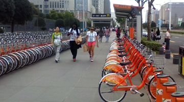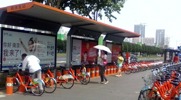 日,南京青奧會舉辦期間,世界各地的運動員、游客等齊聚南京,共享盛會。在青奧會舉辦場館附近有不少公共自行車站點,靚麗的橙色公共自行車吸引了很多市民、游客和外國友人的關(guān)注。