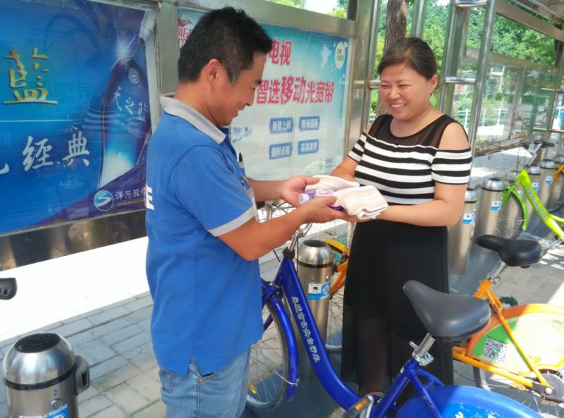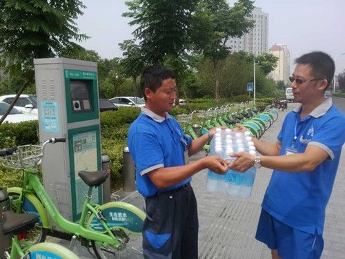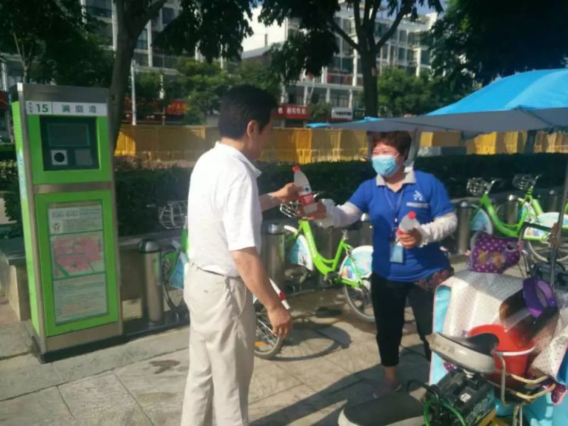 在7月27日下午最熱的時間段,漣水公共自行車管理中心負(fù)責(zé)人前往站點(diǎn),為那些堅守在一線的巡檢師傅們送上一片清涼。