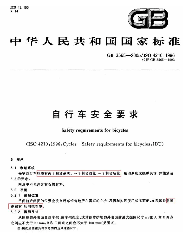 其實,在《中華人民共和國國家標準》關于“自行車安全的要求”中,我國對自行車的剎車有著明確且統(tǒng)一的標準和規(guī)定: