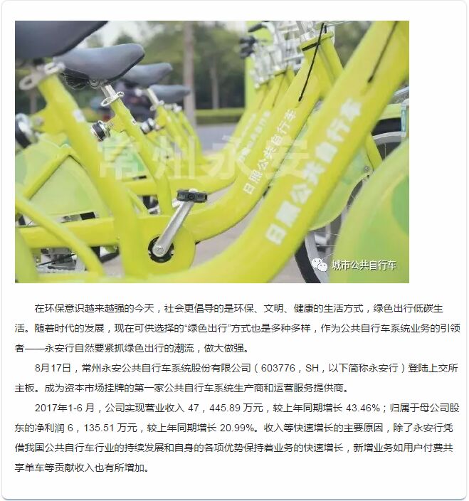 招股說明書顯示,永安行成立于2010年,以公共自行車系統(tǒng)的研發(fā)、銷售、建設(shè)、運(yùn)營(yíng)為核心業(yè)務(wù),旨在運(yùn)用物聯(lián)網(wǎng)技術(shù)在各市縣構(gòu)建綠色交通體系,為廣大民眾提供綠色交通服務(wù)。在公共自行車行業(yè)處于先發(fā)和領(lǐng)軍地位。