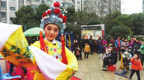 核心提示:昨天下午,雖然室外天氣陰冷,但香江花園熱鬧非凡,滬劇《洞房》、越劇《借紅燈》、錫劇《雙推磨》等耳熟能詳、喜聞樂見的經(jīng)典名劇精彩選段輪番上演,高潮迭起,讓小區(qū)里的居民大飽眼福、耳福,直呼過癮,現(xiàn)場不時響起陣陣掌聲和歡呼聲。今年71歲的胡奶奶坐在前面,一邊聽一邊跟著舞臺上的演員唱,她樂呵呵地告訴記者,她記得小時候過年除了穿新衣服,有好吃的,最開心的就是全家人一起扛著凳子去看戲,“現(xiàn)在我已經(jīng)五六十年沒有看過戲了,今天送戲到家門口,真是開心。”