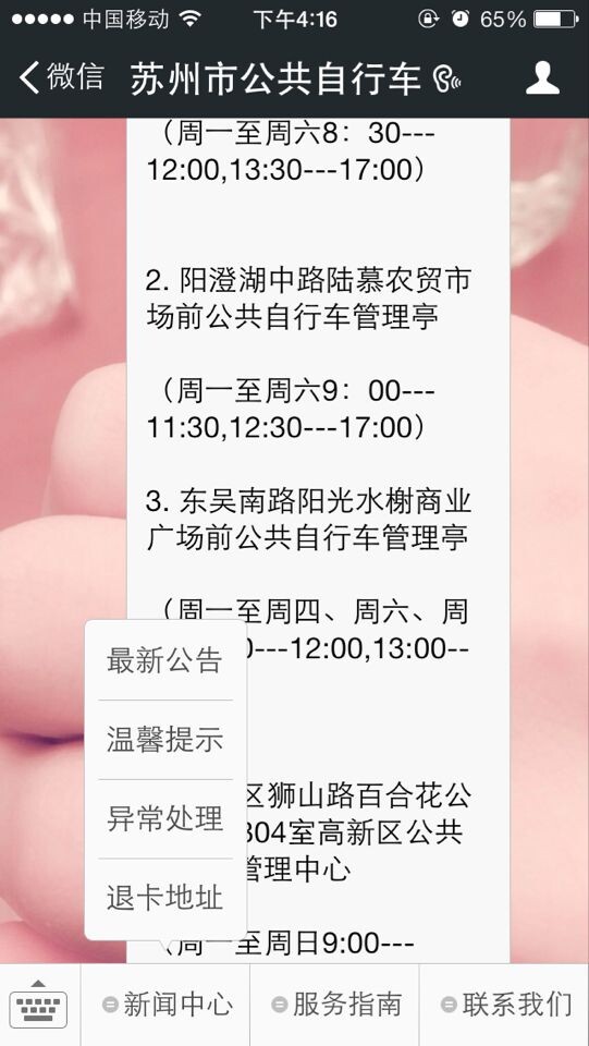 為了更方便市民借還公共自行車,在總公司推出手機微信快捷查詢之后,現(xiàn)蘇州公共自行車也開通了微信公眾號。微信號:ggzxc924943037 微信名稱:蘇州市公共自行車。加入蘇州公共自行車微信之后,微信下方會顯示“新聞中心”、“服務指南”、“聯(lián)系我們”,如下圖: