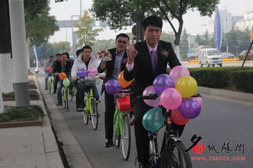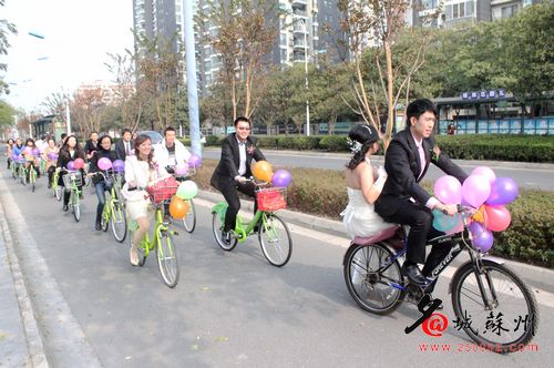 經(jīng)過再三商議,陳勇決定用公共自行車隊迎娶新娘。于是,10月21日上午11:08,陳勇騎著一輛山地自行車出發(fā),身穿白色婚紗的新娘坐在單車后座,臉上洋溢著幸福的喜悅。