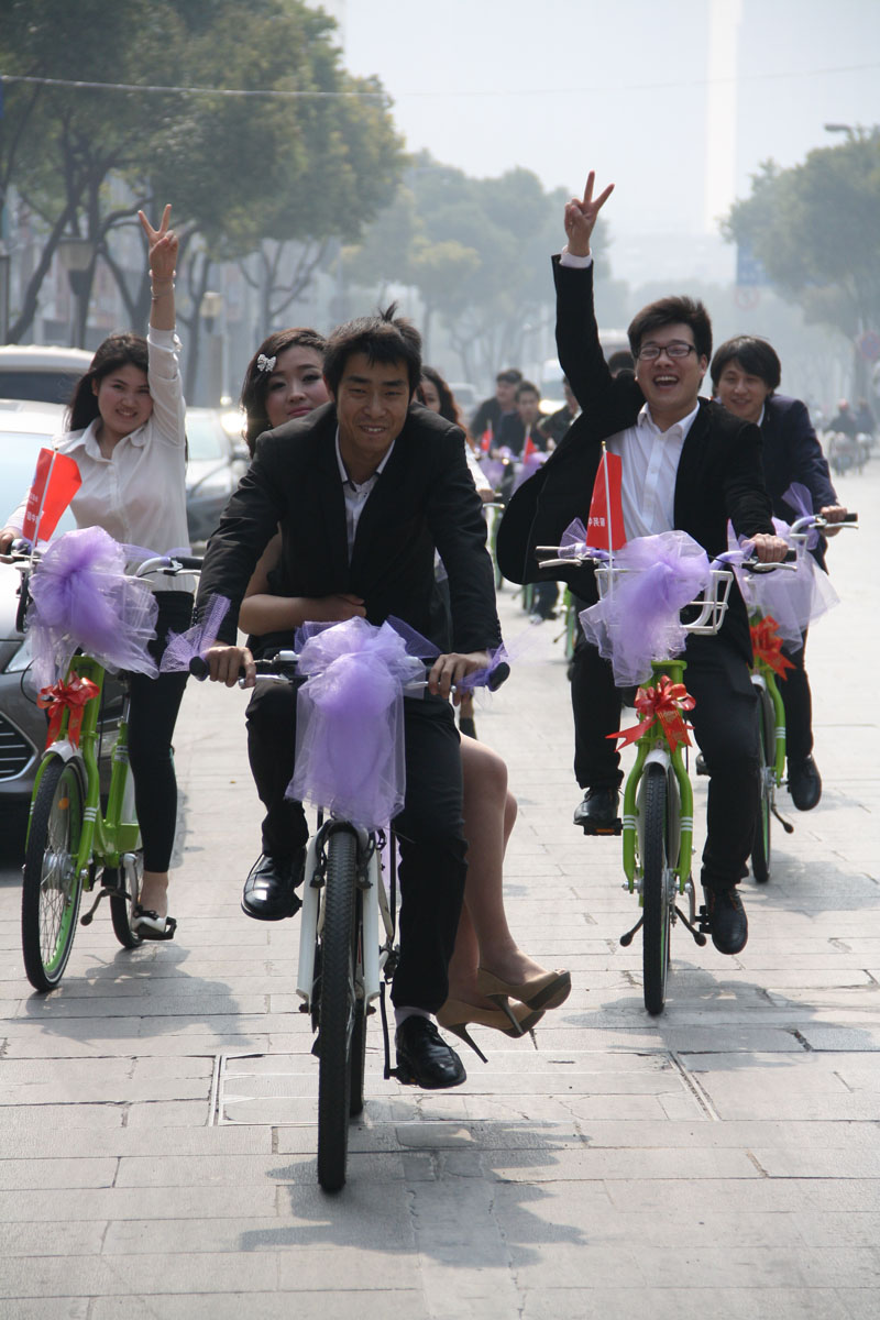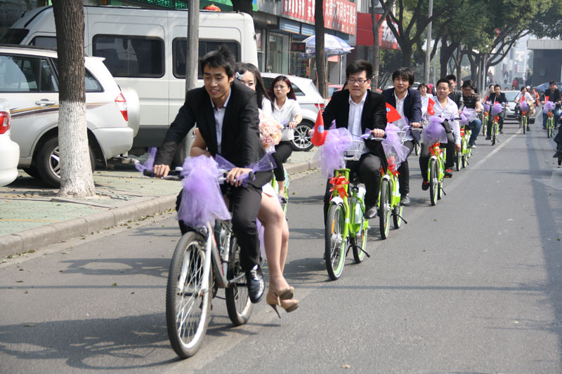 劉川想到,新北區(qū)的街頭有不少草綠色的公共自行車,特別好看,“這一溜統(tǒng)一顏色的婚車,場面就有氣勢了!”于是劉川嘗試著聯(lián)系常州永安公共自行車公司,將自己的想法跟對方企業(yè)負(fù)責(zé)人一交流,對方很爽快地同意提供20輛嶄新的自行車。