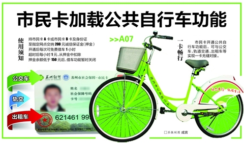 據(jù)介紹,年齡16到70周歲的市民,持本人市民卡a卡或者市民卡b卡加本人身份證,至市民卡指定服務網(wǎng)點或者公共自行車指定服務網(wǎng)點,交納200元公共自行車押金,就可以在市民卡上立即開通公共自行車借車功能,在姑蘇區(qū)、吳中區(qū)、相城區(qū)、工業(yè)園區(qū)和高新區(qū)借用公共自行車。