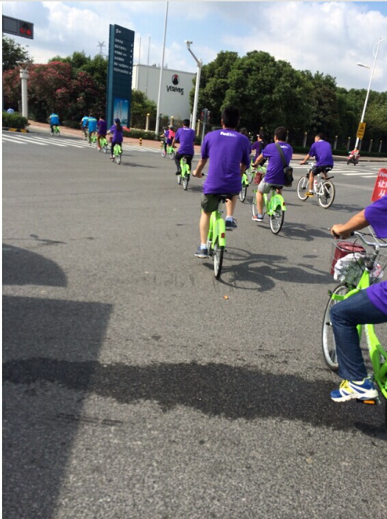這次活動準(zhǔn)備了30輛綠色自行車,掛上環(huán)保旗幟。沿著園區(qū)的主干道進(jìn)行了1~2小時的騎行。騎行隊伍分為兩支,一支主要圍繞湖西商業(yè)中心進(jìn)行騎行,一支圍繞湖東圓融廣場騎行。沿路向環(huán)衛(wèi)工人等戶外工作人員發(fā)放愛心禮品。