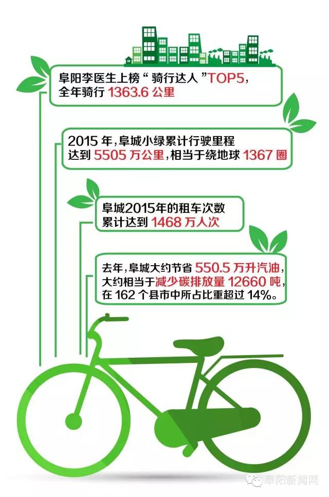 2015年,162個(gè)縣市累計(jì)騎行18.3億公里,相當(dāng)于繞地球45750圈。 2015年,阜城小綠累計(jì)行駛里程達(dá)到5505萬公里,相當(dāng)于繞地球1367圈。