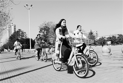 在安徽省阜陽市,投入運營的公共自行車項目受到越來越多市民的青睞。圖為今年1月19日,阜陽市民騎著公共自行車出行。