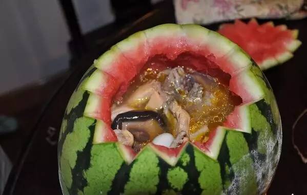 西瓜雞曾在蘇州當(dāng)?shù)爻掷m(xù)風(fēng)靡四五十年,因著只能在夏天吃,且必須當(dāng)天烹煮當(dāng)天吃,不能貯存又無法攜帶,因此知道的人還真不那么多。西瓜與母雞共蒸,瓜的清香滲入雞肉,雞肉又能保持原有的鮮嫩,考究點(diǎn)的店家還會(huì)在西瓜皮上雕圖刻畫,極富美味與觀賞性。
