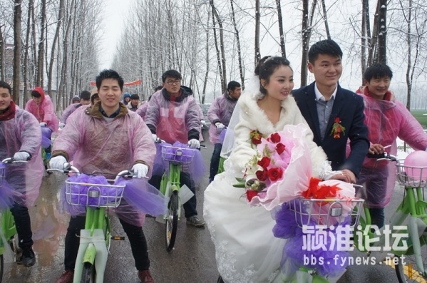 30輛公共自行車整齊碼開,時云濤“打頭陣”騎在最前面,后面時云濤的親朋好友們,四人一排,整齊劃一。因?yàn)橐恢痹谙麓笱吕傻募胰诉€特別貼心的為騎自行車的人們準(zhǔn)備了防寒的手套和粉色的雨衣,穿著小粉,騎著小綠,浩浩蕩蕩去新娘家迎親去,一支騎著公共自行車的婚車隊(duì)伍“招搖過街”也是賺足了回頭率,有不少路人駐足觀看,沿街接受路人的祝福,再配上這漫天大雪,簡直太浪漫了。新娘閆瑞金告訴記者:“時云濤平時在生活中就是一個非常浪漫的人,兩人在談戀愛時就經(jīng)常會想出許多有創(chuàng)意的點(diǎn)子我開心,這次用公共自行車來迎親也是讓我非常意外,而且也非常有紀(jì)念意義,我相信這個婚禮會讓我終身難忘。外面一直在下雪,我也非常感動,他也和迎親隊(duì)伍一路騎車過來,相信我們以后一定會幸福到永遠(yuǎn)?!?/p>