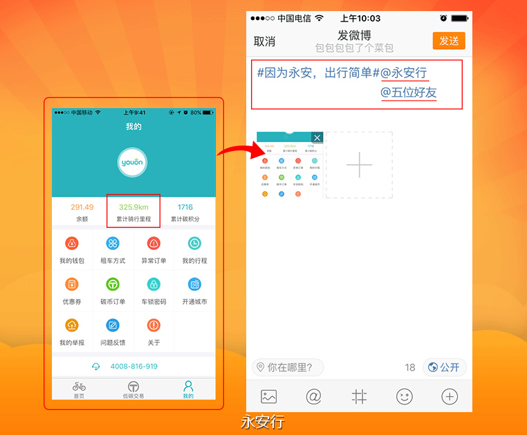 活動(dòng)詳情:在規(guī)定時(shí)間內(nèi),關(guān)注“永安行”官方微博,將你的永安行app中,"累計(jì)騎行里程"截圖發(fā)到微博,帶上話題#因?yàn)橛腊?,出行?jiǎn)單#,@永安行 以及5位好友,均有機(jī)會(huì)獲得“永安新年驚喜福袋”。
