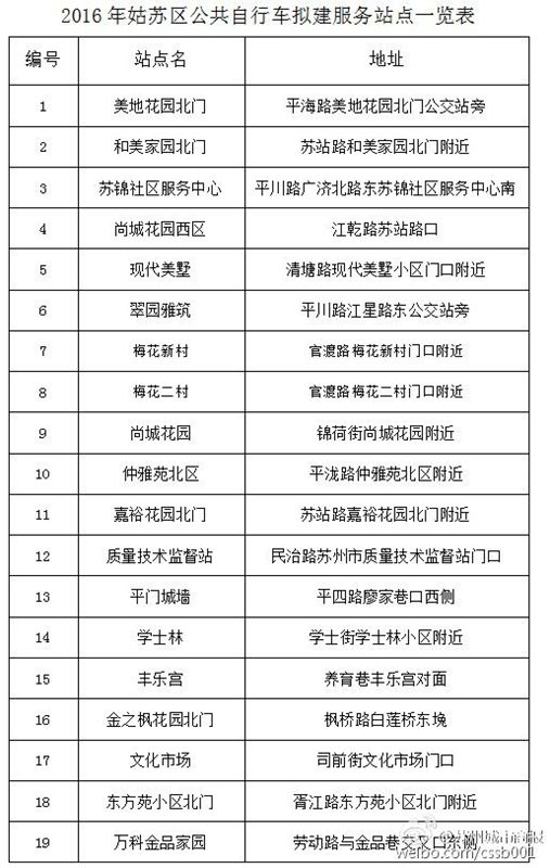 姑蘇區(qū)公共自行車服務網點擬定2016年新建70個,計劃投放公共自行車2000輛?,F(xiàn)將前期60個站點予以公示。公示時間4月18日-4月25日,如有意見或建議可通過電話、郵件及12345便民熱線等方式向市市容市政管理局反映。電子郵件:szbicycle@126.com;市數(shù)字城管:0512-69331110;其他方式:12345便民熱線 寒山聞鐘論壇。